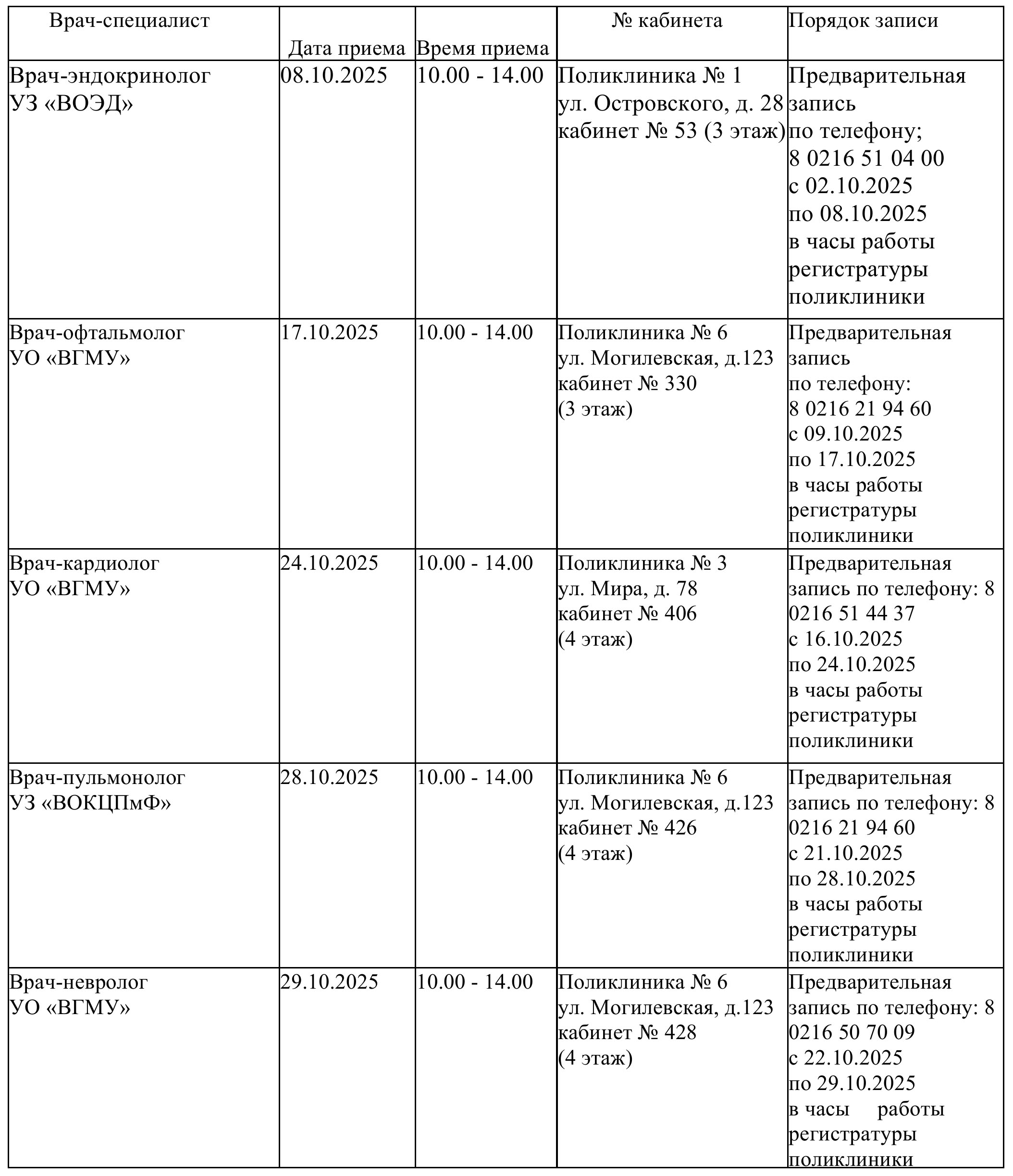 График выездов врачей-специалистов г.Витебска в учреждение здравоохранения "Оршанская центральная поликлиника" для оказания лечебно-консультативной помощи населению