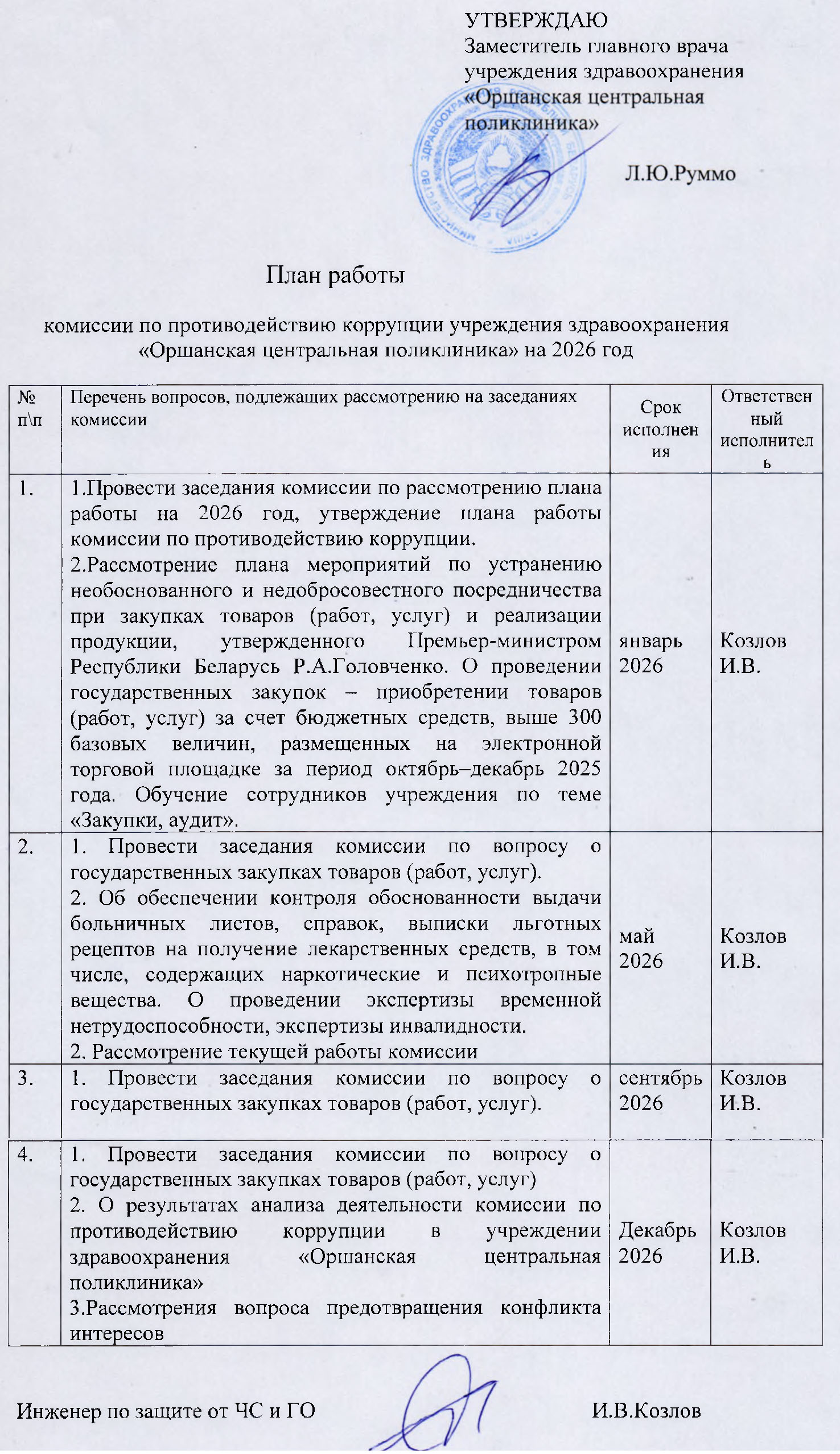 План работы комиссии по противодействию коррупции УЗ «Оршанская центральная поликлиника» на 2026 год