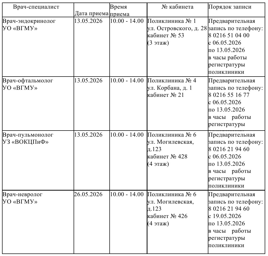 График выездов врачей-специалистов г.Витебска в учреждение здравоохранения "Оршанская центральная поликлиника" для оказания лечебно-консультативной помощи населению