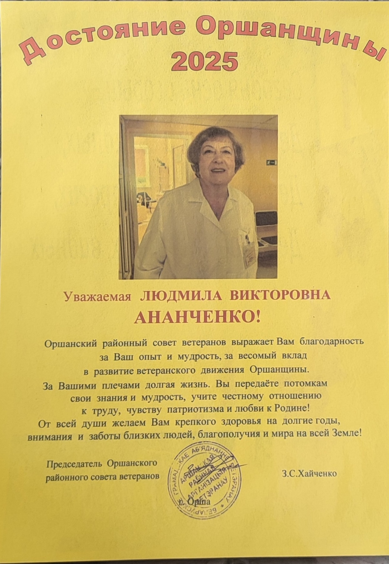 Оршанскую центральную поликлинику в этом году в номинации «Достояние Оршанщины» представила ветеран здравоохранения, врач-невролог городской больницы №1 им. Семашко, Ананченко Людмила Викторовна, которую пришли поздравить председатель первичной ветеранской организации Оршанской центральной поликлиники А.П. Шпак, председатель Оршанской районной ветеранской организации З.С. Хайченко.
