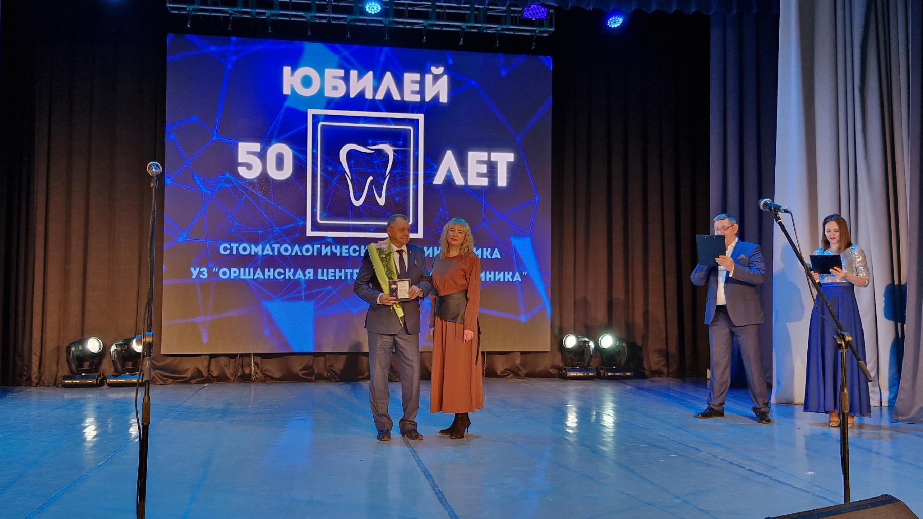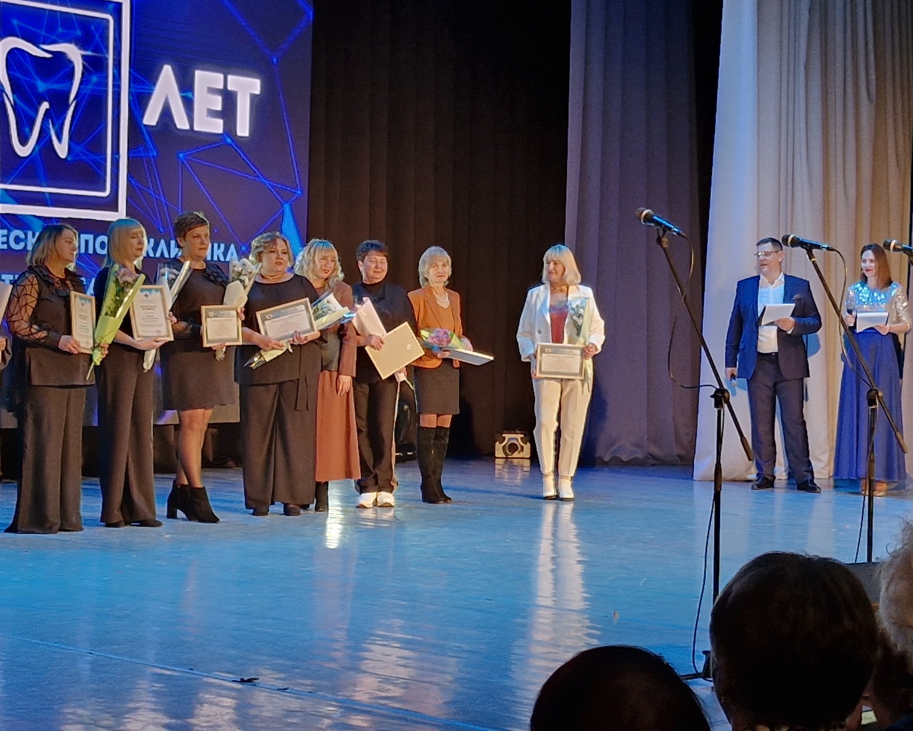 Специалисты стоматологической поликлиники принимали заслуженные поздравления в свой адрес. Свой золотой 50-летний юбилей они отпраздновали в городском Центре культуры “Победа”.