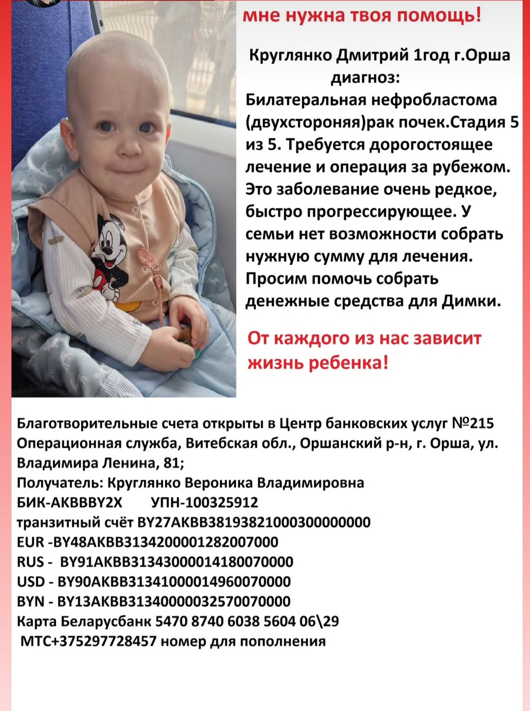– Нашему Димке год. Мы из г. Орши, но вынуждены сейчас поселиться в детском онкоцентре в Боровлянах. Очень больно писать об этом… Мы до сих пор не можем осознать, что это не кошмарный сон, а страшная реальность.